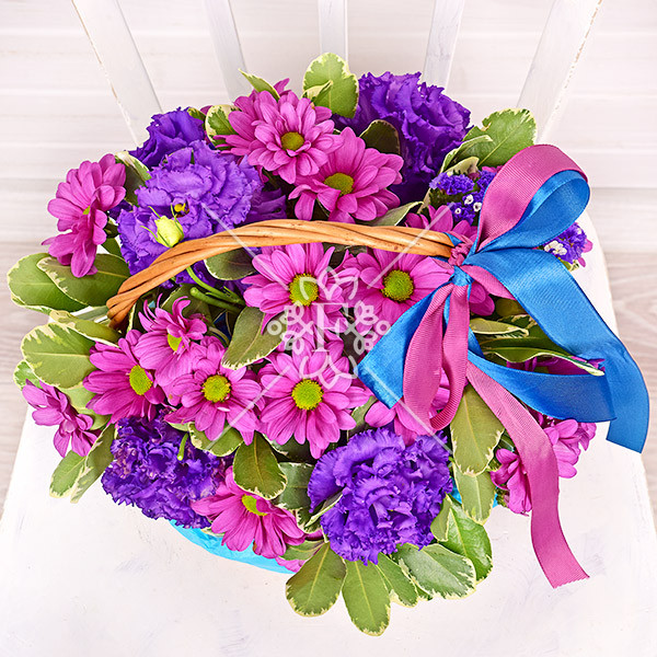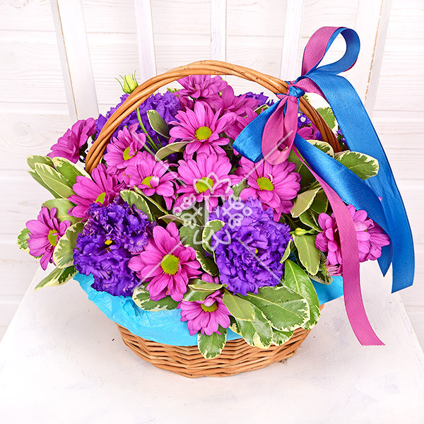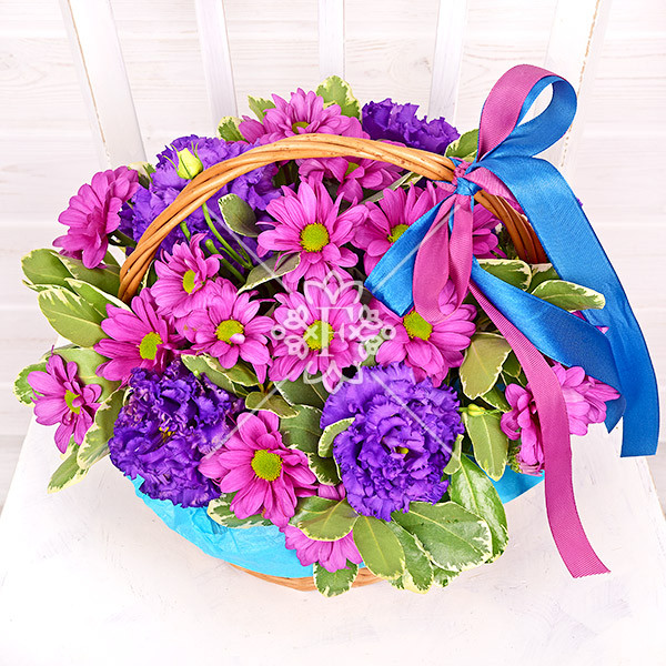 Хризантема сиреневая - 5 шт., эустома фиолетовая – 4 шт., зелень декоративная (питтоспорум – 2 шт.), оазис, корзинка, лента.